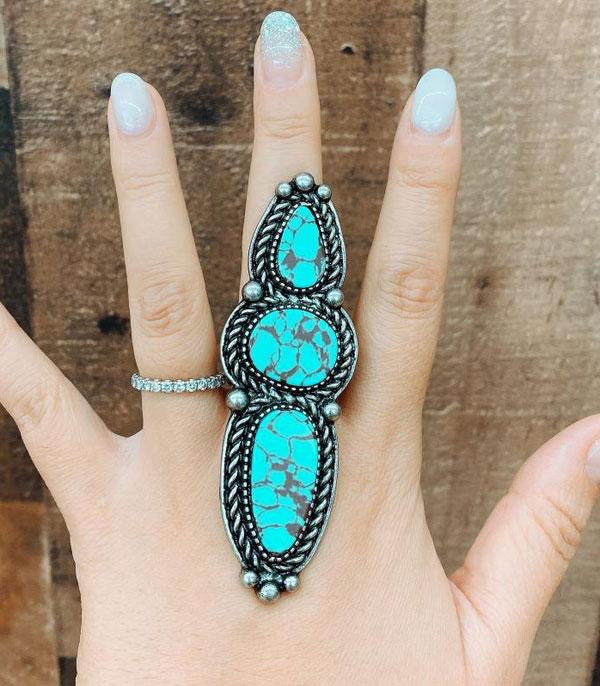Texas size ring anyone?! Definitely a statement piece but a must have! Blue turquoise color stones with a stretchy elastic band.